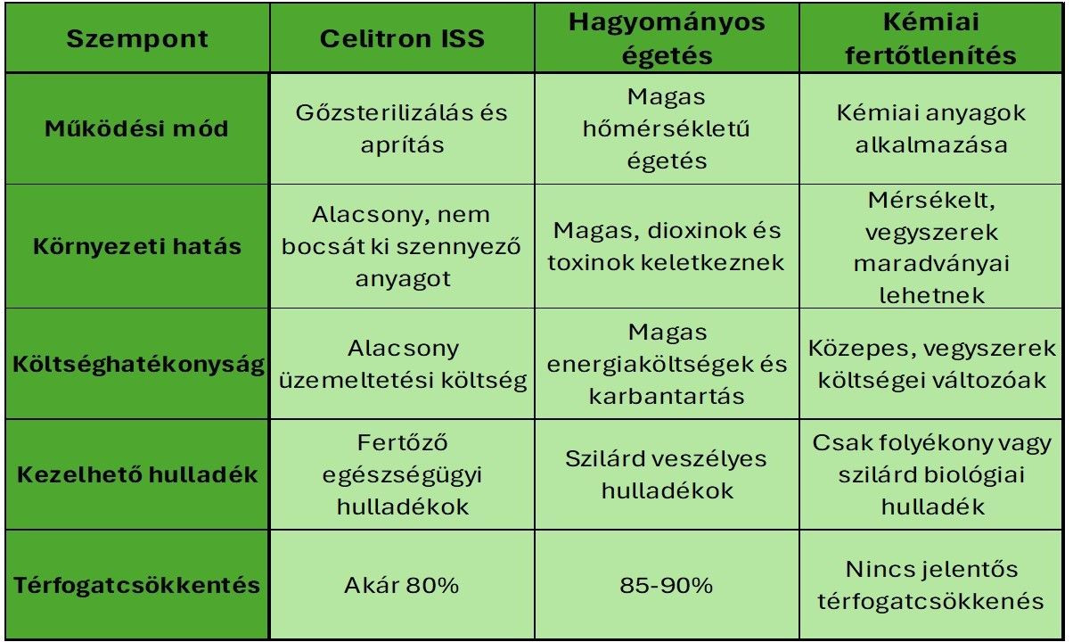 A modern egészségügyi hulladékkezelési módszerek között az égetés, kémiai fertőtlenítés és a gőzsterilizálás-alapú ISS technológia mind eltérő előnyökkel és hátrányokkal rendelkeznek. A Celitron ISS rendszere kiemelkedik a környezetbarát, költséghatékony és biztonságos működésével, miközben jelentősen csökkenti a hulladéklerakók terhelését.